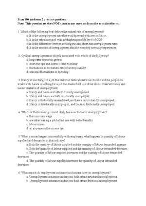 Econ 104 Midterm 2 Practice Questions Econ 104 Midterm 2 Practice Questions Note This Question Studocu