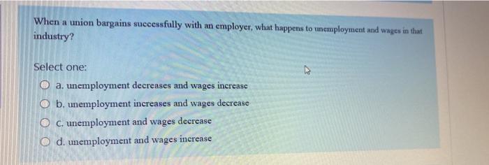 When a union bargains successfully with an employer in that industry a. Both wages and unemployment decrease. 3 on a question When a union bargains successfully with employers in that industry a.